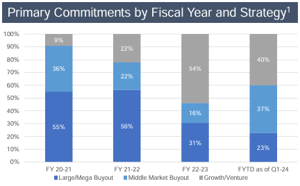 In fiscal year 2021, the fund committed 91 percent of its private equity dollars to buyout strategies. Year-to-date, that figure has dropped to just 60 percent.
