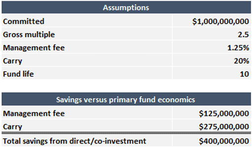 Board materials shared at the meeting included an illustrative scenario showing estimated savings of $400 million for every $1 billion committed to direct co-investment instead of traditional fund investments.