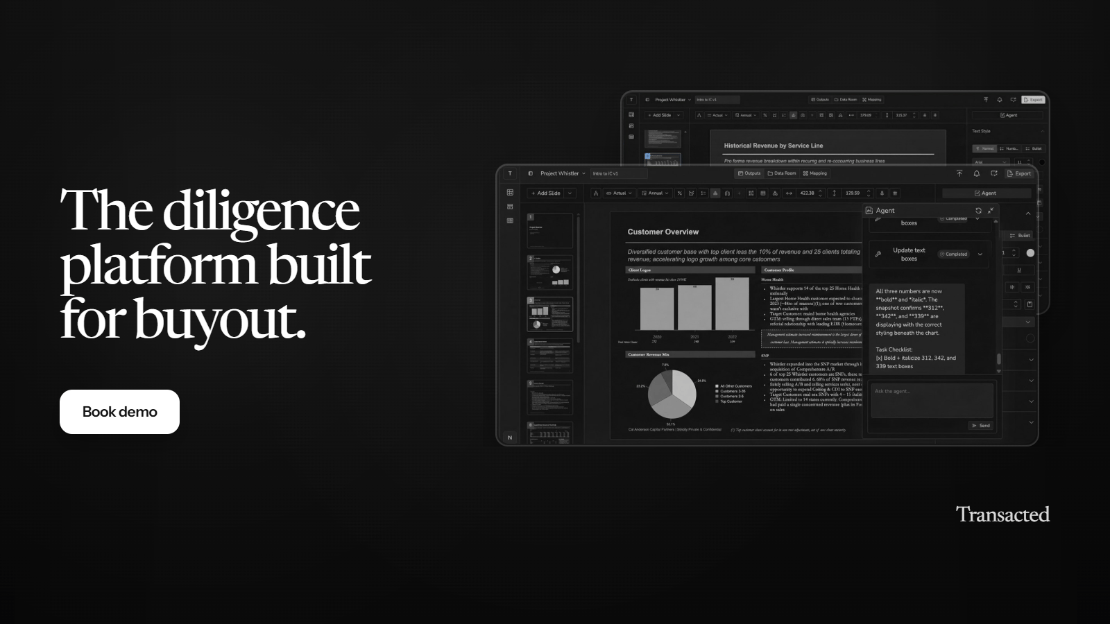 Transacted streamlines the business diligence process from data analysis to outputs and deliverables — helping investment professionals power through the most time-consuming tasks with ease.