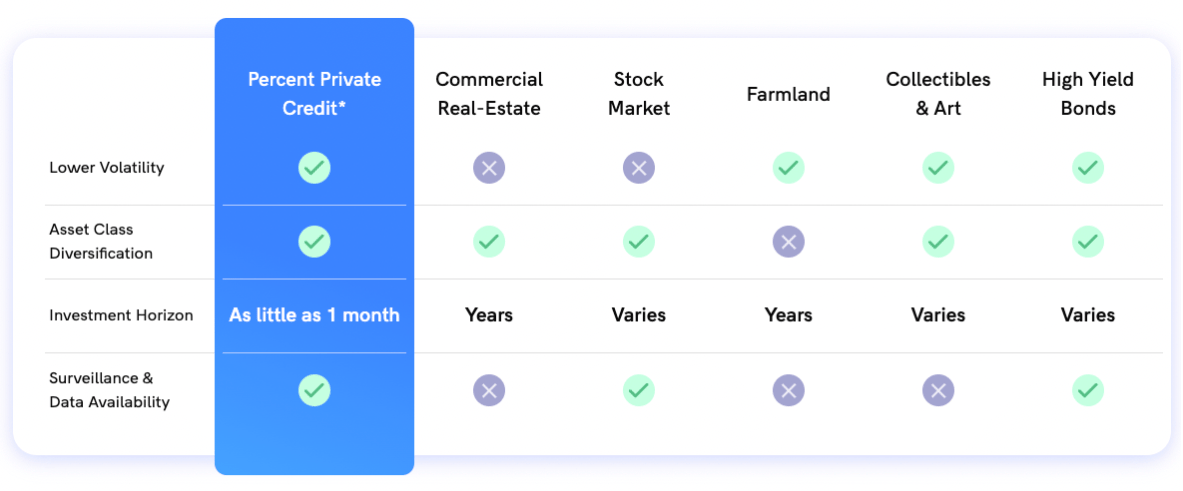 Percent makes private credit investing available to all accredited investors for as little as $500. Professionalize your portfolio with: